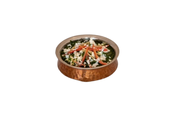 Homemade cottage cheese, saffron flavoured spinach, fresh herbs